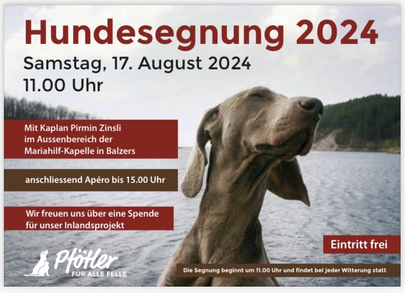 Auch dieses Jahr findet wieder die beliebte Hundesegnung bei der Maria-Hilf Kapelle in Balzers statt. Die Segnung wird am Samstag den 17.08.2024 stattfinden und beginnt um 11:00 Uhr. Wir freuen uns sehr über zahlreiches erscheinen.